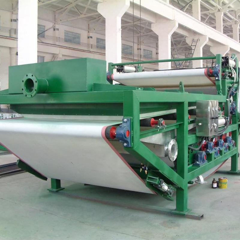 带式压滤机是在引进国外压滤技术基础上研制成功的新机型,该设备是通过两条滤带缠绕在一系列顺序排列、大小不等的辊轮上,利用滤带间的挤压和剪切作用,来脱除料浆中水分的一种压滤设备,具有着能连续作业、自动化程度高、节能、使用维护方便等优点,是一种进行污泥脱水减量化处理的理想设备。